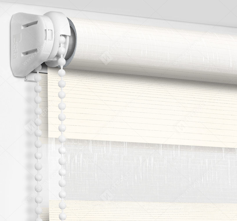 Рулонные шторы Зебра работают следующим образом: полоски ткани смещаются так, чтобы совпали светлые или темные слои, образуя, плотное или более прозрачное полотно. Так обеспечивается ночной или дневной режим затемнения. Также можно поднять шторное полотно полностью, открывая окно. По умолчанию - цвет фурнитуры белый.